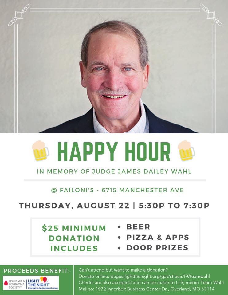 Date and Time Thu, 08/22/2019 - 17:30 Location St. Louis, MO United States Information Page URL https://www.lightthenight.org/content/team-wahl-2019-happy-hour