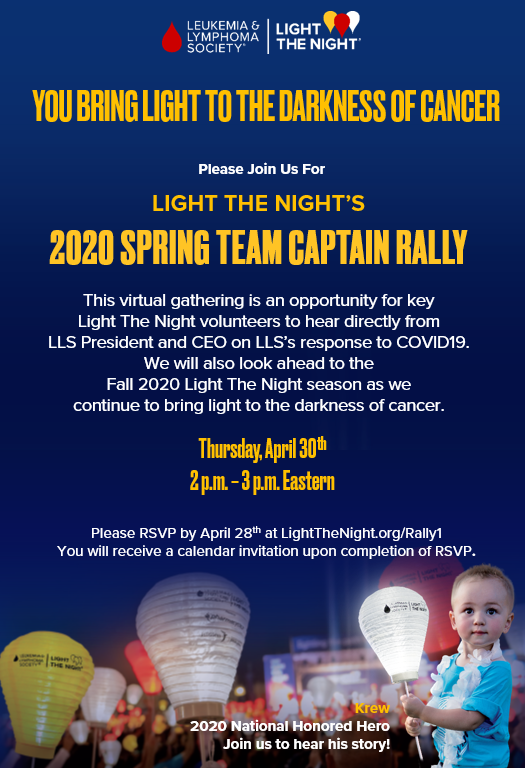 Join us to hear directly from LLS President and CEO on LLS's response to COVID-19. We will also look ahead to the Fall 2020 Light The Night season. Click "learn more" to RSVP!